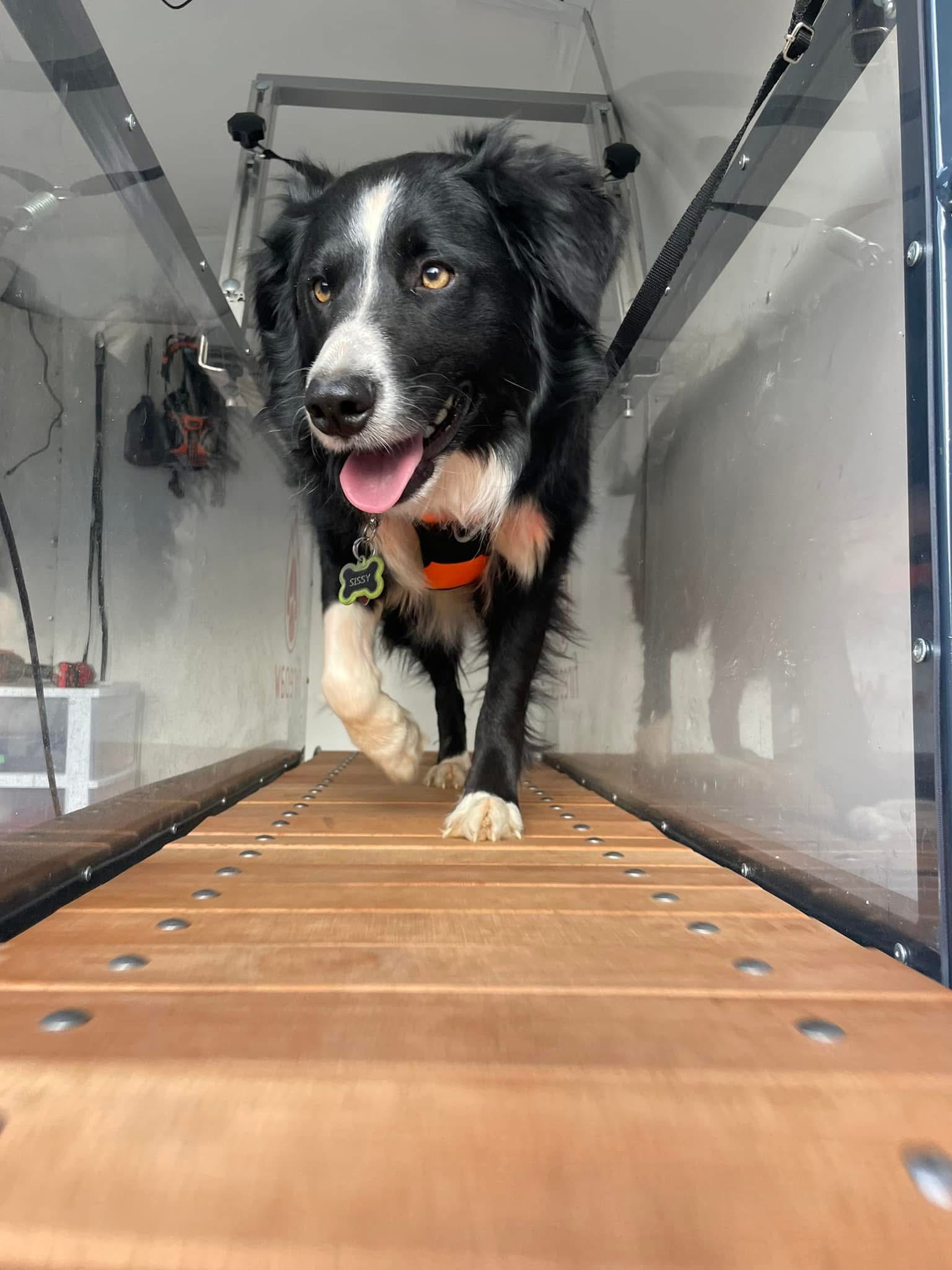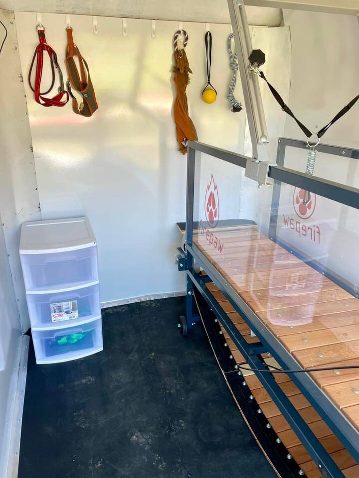 We are a temperature controlled mobile unit equipped with a state of the art, NON-MOTORIZED, dog powered Slat Mill, designed specifically for dogs to provide optimal joint support, safety, and fun while they run! This is a custom built Slat Mill made by FirePaw. It is controlled solely by your dog who is free to walk or run as fast as they want. They control the speed and can slow down or stop whenever they choose. Some dogs can reach upwards of 40 mph! We do have a handbrake to stop them if they choose to keep running when they may otherwise need to take a break.